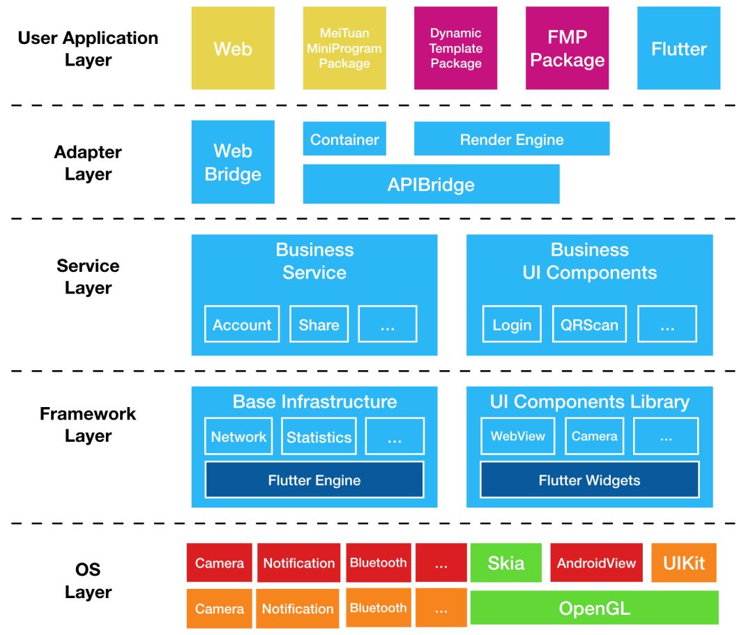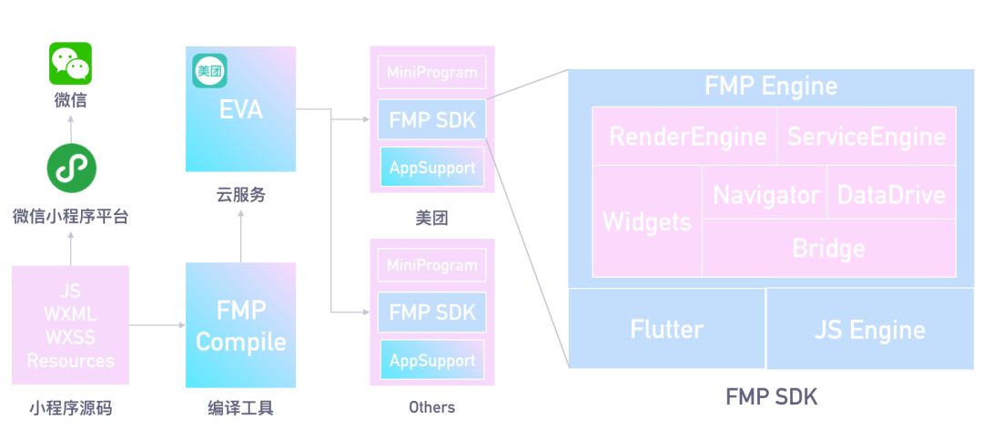 美团终端技术研发组的内部发起了一个代号为 FMP 的项目,目的在于解决“存量”问题。FMP 指 Flutter Mini Program,目的是用 Flutter 作为跨平台的渲染引擎,完整解析小程序包中 XML、CSS 和 JS 的一个计划。此举可以兼顾 Flutter 的高效与多平台一致,又可以支撑原有的小程序项目,让业务开发不需要多学习 Dart 语言与 Flutter 平台。FMP 目前的设计结构如下: