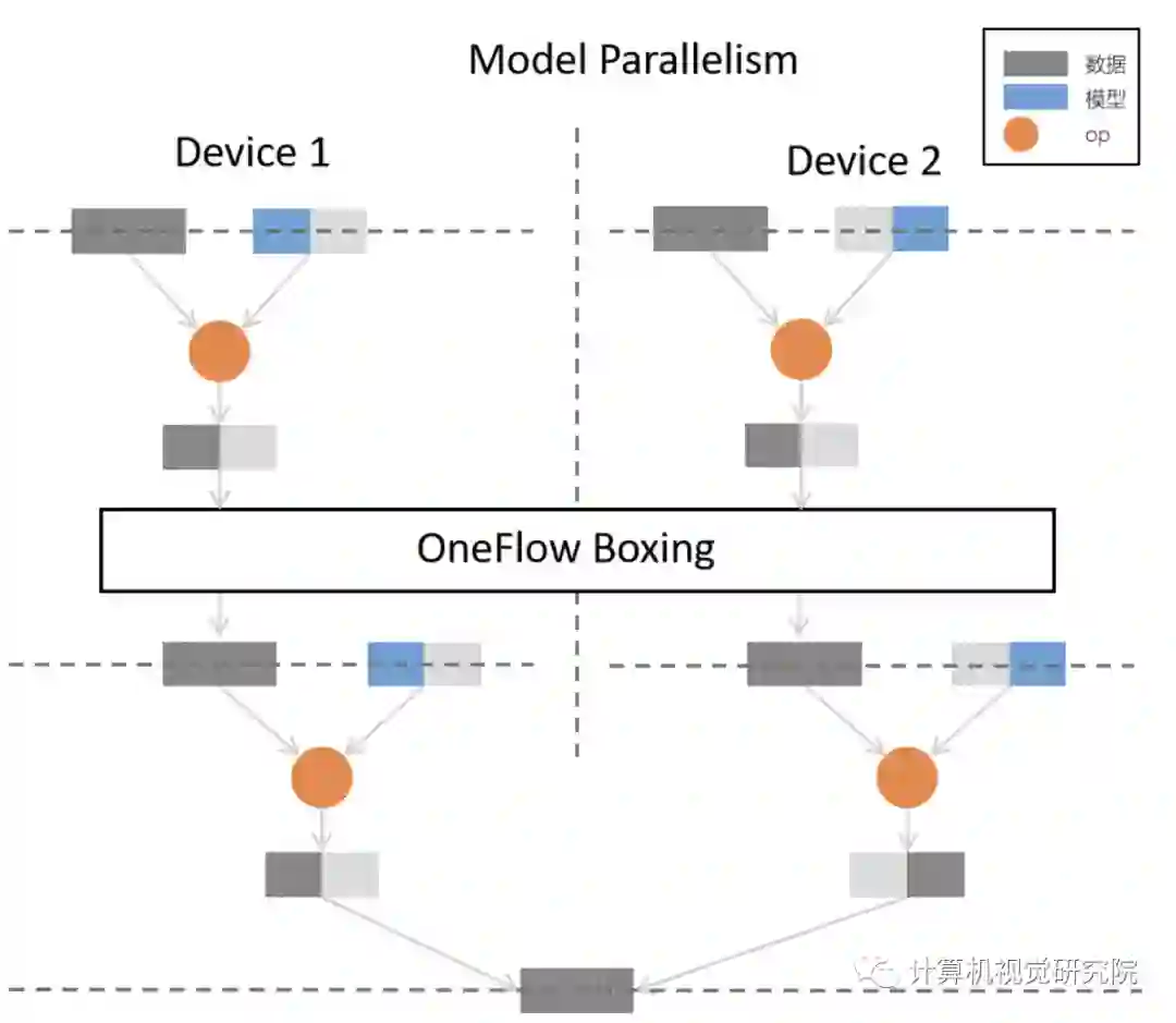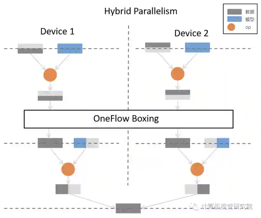 boxing 的内部机制虽然复杂,但是对于用户而言是透明的,我们仅仅是防止读者产生迷惑才加入了 boxing 的图示,对于本文而言,我们只需要了解:OneFlow 会自动协调好分布式中数据的同步问题。