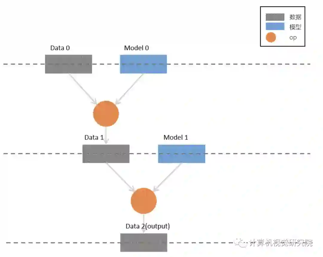 各层中,有 样本 (灰色矩形)、 模型 (蓝色矩形),以及作用在两者之上的 op (圆形),为了简化讨论,我们也可将样本与模型限定为 矩阵 ,作用在它们之上的op为 矩阵乘法 。