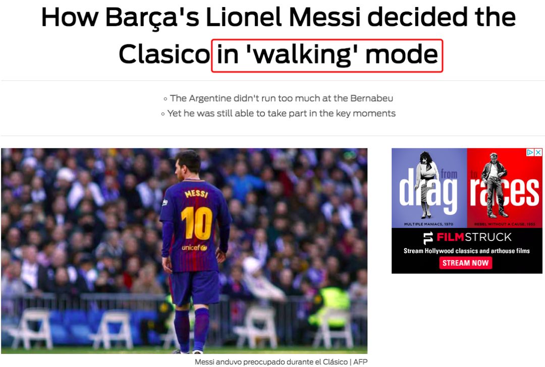 2017年12月,在巴塞罗那与皇家马德里之间的一场经典大赛之后,媒体广泛报道的一件事是,梅西在场上移动了大约5英里的距离,其中83%是在“走”(跟这次世界杯对战冰岛一样)。 尽管如此,那场比赛梅西不但进球,还参与了助攻,巴塞罗那3-0获胜。