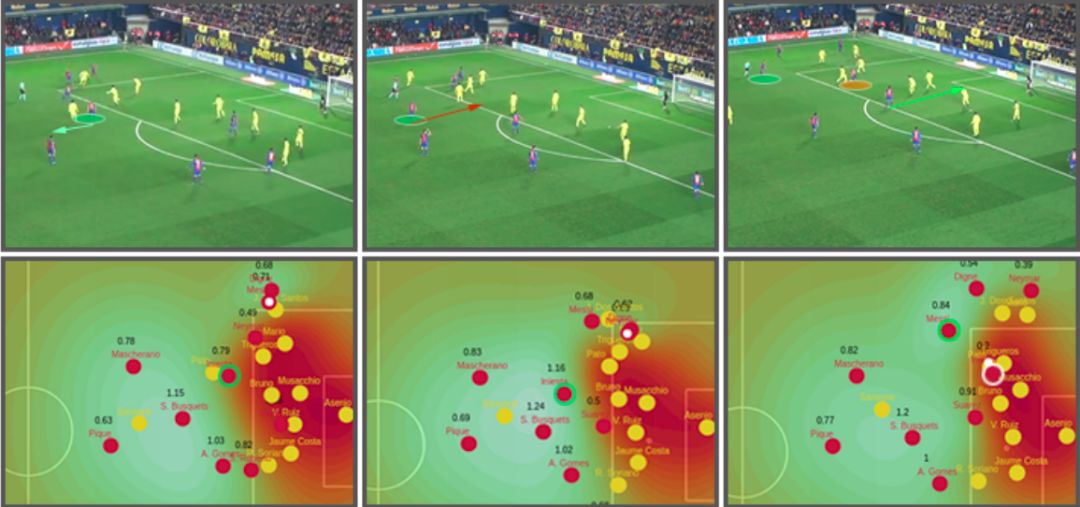 将2017年1月西甲联赛中巴塞罗那队和比利亚雷亚尔队的数据用在这些模型里,Bornn和Fernandez发现,为巴塞罗那队获取场地最多的,是布斯克茨(中场)、伊涅斯塔(中场)和梅西(前锋)。
