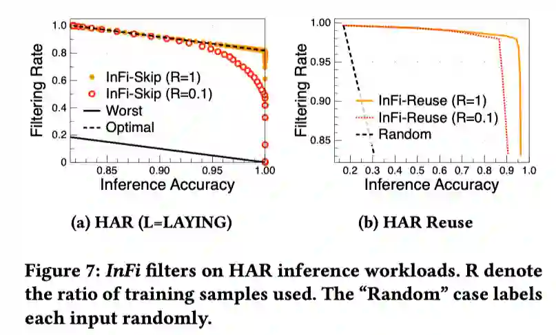 InFi 的训练成本也很低。在一个基于运动信号的动作识别应用中,仅使用 10% 的训练数据集即可得到过滤表现接近最优的 SKIP 和 REUSE 结果。InFi 可在保持超过 95% 推理精度的情况下,节省 80% 的推理运算。