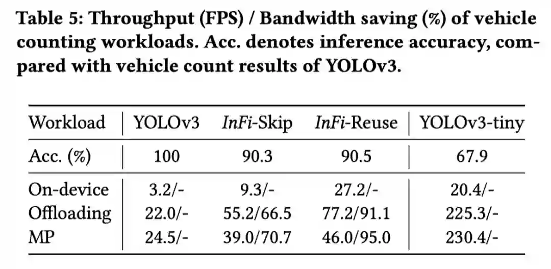 以在城市道路监控视频中进行车辆计数的任务为例,在端上推理时,相较于原始的工作流,采用 SKIP 和 REUSE 机制的 InFi 方法分别能够将推理吞吐提升 1.9 和 7.5 倍,同时皆保持超过 90% 的推理精度;在进行端 - 边模型切分推理时,两种机制下的 InFi 分别能够节省 70.7% 和 95.0% 的通信带宽。
