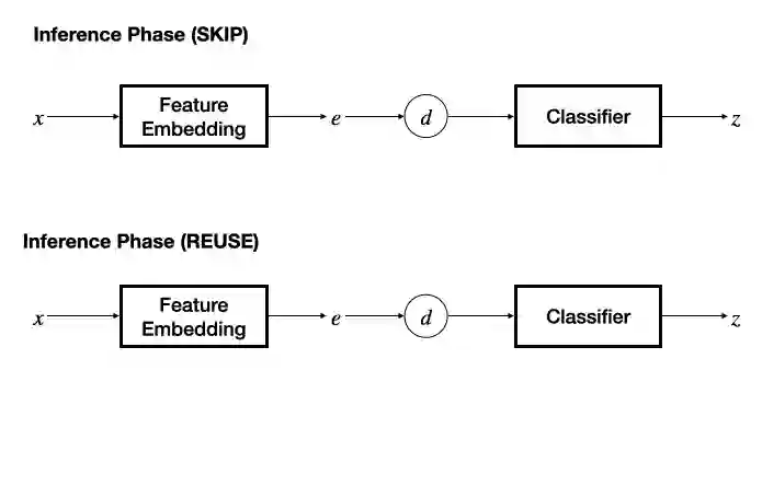 在推理阶段,若采用 SKIP 机制,则将另一个输入的特征固定为零,退化为基本的分类器,根据预测的冗余性标签决策是否跳过当前输入数据;若采用 REUSE 机制,则需要维护一个 “输入特征 - 推理输出” 表作为缓存,通过计算当前输入特征与缓存的输入特征之间的距离,采用 K - 近邻方法决策是否重用缓存的推理结果。