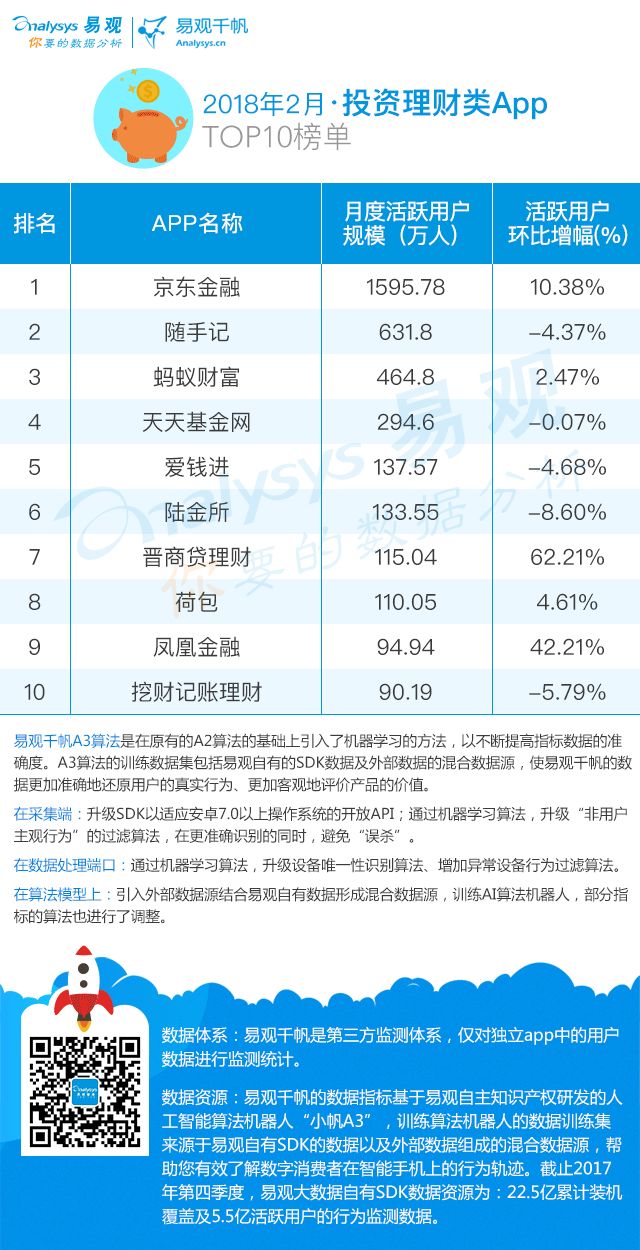 在2018年2月最新投资理财App排行榜中,京东金融以1596万稳居榜首,其次是随手记和蚂蚁财富,榜单中的晋商贷理财本月月活增幅达62%,连续两个月月活增幅超过50%,增幅惊人,凤凰金融本月环比增幅也达42%。