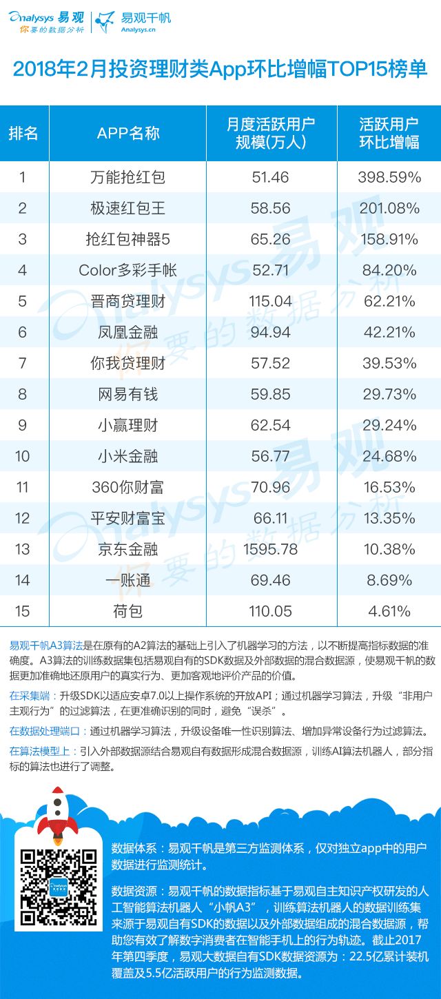 从环比增长来看,据易观千帆统计,月活50万以上投资理财应用环比增幅榜中,排名前三的都是抢红包App,抢红包应用是一款辅助工具,一般需要微信授权后自动抢微信红包,从活跃用户规模来看,抢红包应用的需求较大,如抢红包神器在产品迭代上首创定时红包功能,并且凭借快捷的微信提现功能快速拉新,2月活跃用户环比增幅158.91%,涨幅迅速。而晋商贷严格意义上是一款网贷应用,在产品迭代上通过新增回款日历、会员生日礼包、在线客服等功能优化用户体验,提升用户粘性;在活动运营上,以周年活动、积分抽奖、新手捞金等形式留存用户,实现用户的快速增长。