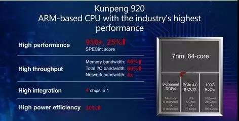 此外,华为还染指ARM处理器芯片。今年1月7日,在深圳发布会上,华为宣布推出业界最高性能的基于ARM处理器鲲鹏920芯片(Kunpeng 920)以及三款泰山(TaiShan)ARM服务器。据披露,鲲鹏920有64个内核,工作频率高达2.6 GHz,支持8通道DDR4,以及一对100G RoCE端口。华为表示,该芯片的功效比其竞争对手高出30%。