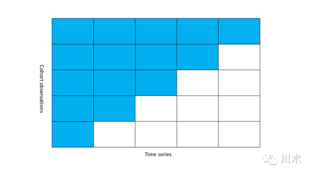 随着数据运算能力的提高,队列分析的方式逐渐展露头脚。英文名称为cohort analysis,说实话我不知道怎么表述这个概念,我的理解就是**按一定的规则,在时间颗粒度上将观察对象切片,组成一个观察样本,然后观察这个样本的某些指标随着时间的演进而产生的变化**。目前使用得最多的场景就是留存分析。