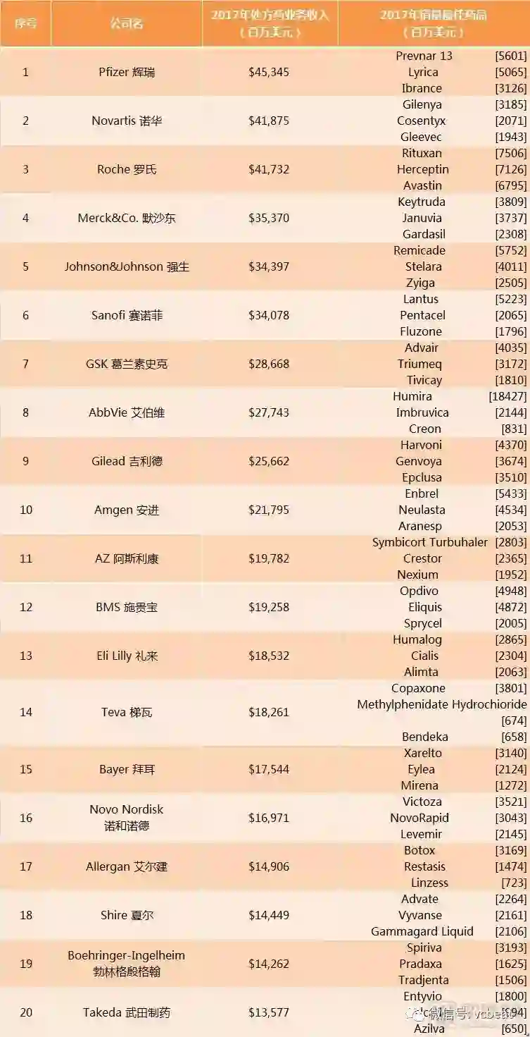 以下是全球TOP20药企2017年制药业务收入情况,以及属于他们的重磅炸弹: