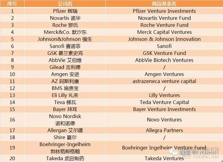 TOP20药企的风投基金