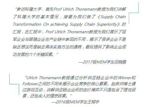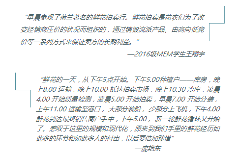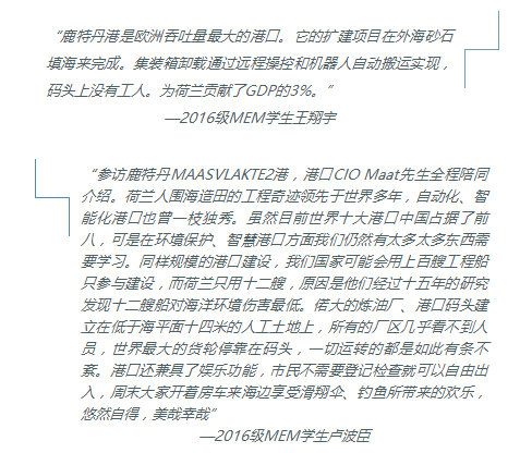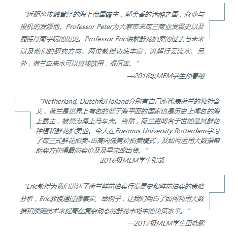 “本期参访MEM学员来自制造业、互联网、能源、物流、通信等产业,在参观学习过程中,每到一站,学员们认真聆听之余都会结合自身产业背景和讲座嘉宾或讲解人员就各类问题展开热烈讨论,大家都十分希望通过此次欧洲之行能够学到先进经验并对自己的工作能够有所帮助。无论是慕尼黑宝马总部整洁有序的汽车生产线,还是西门子首席工程师对工业4.0深入浅出的讲座,亦或是科隆大学Thonemann教授对供应链的精彩讲解,以及荷兰皇家鲜花公司表面平静实则紧张非凡的鲜花拍卖,还有鹿特丹抽沙填海的壮观人造港口,等等诸多课程学习让学员们收获匪浅、受益良多。”