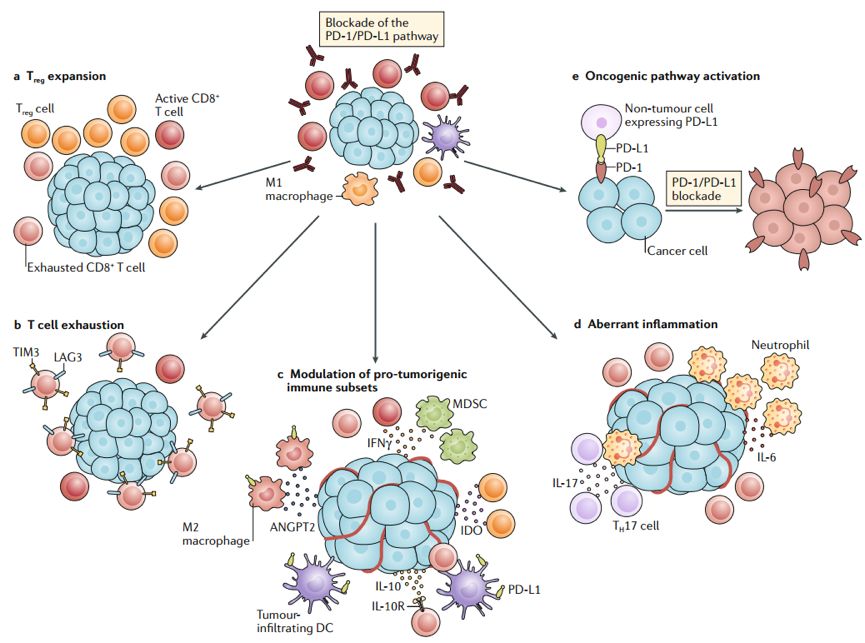 目前,引起HPD的生物学机制尚不清晰,2018年发表于Nature Reviews Clinical Oncology杂志上的综述[2]总结了PD-1/PD-L1抑制剂能导致HPD的五大机制,阻断PD-1/PD-L1通路可能:①增强调节性T细胞(Treg)功能;②旁路免疫检查点代偿性增加,导致T细胞耗竭;③影响免疫抑制性细胞群的极化,分泌免疫抑制性细胞因子;④触发不可控的炎性反应;⑤PD-1/PD-L1抑制剂可能引起致癌信号通路的激活。其中,前4项机制为形成免疫抑制微环境,协助肿瘤细胞免疫逃逸,间接加速肿瘤生长,而最后1项机制通过致癌基因的激活直接促进肿瘤细胞生长。随着多项研究的开展与深入,越来越多的证据显示基因变异为HPD风险的潜在标志物。