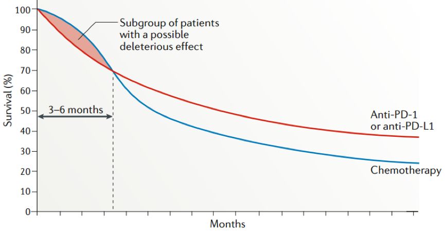 在精准医疗时代下,免疫检查点抑制剂的临床应用愈发广泛,如何提升药物有效率、降低不良反应发生率,已成为实现精准免疫的迫切需求。目前,PD-L1、肿瘤突变负荷(TMB)、错配修复缺陷/高微卫星不稳定(dMMR/MSI-H)等多种生物标志物已用于免疫药物有效人群的筛选。然而,免疫治疗后可以出现HPD,临床试验中发现,免疫治疗对部分患者不仅无效果反而有害,如临床试验[2]中看到的前期的交叉,需要后续进行大量的研究来解决该问题。