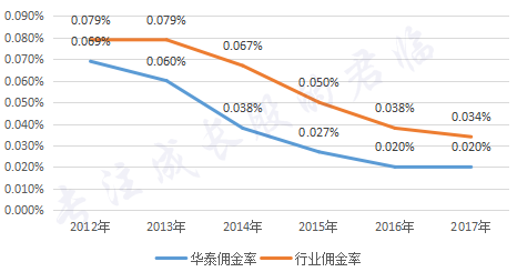 随着券商竞争的加剧,佣金的下降大势所趋,华泰2013年的佣金率为0.06%,2014年虽然大幅下降,但换来了客户数量的大幅增加,仍是一笔划算的买卖。