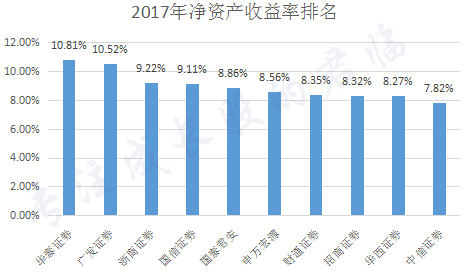 净资产收益率也一直处于行业领先地位,2017 年净资产回报率位居上市券商第一位,显示了公司良好的效益水平。