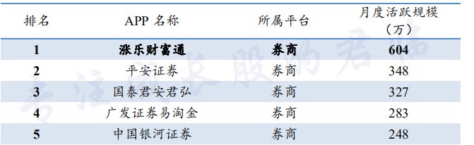 根据易观千帆的数据,2017年12月,涨乐财富通的月活达到604万,大幅领先其后的国泰君安和广发。