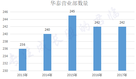 2017年,华泰的营业部数量为242家,在全国排名第10,与之相对比的则是排名第一的市占率,可见华泰线上战略的成功。