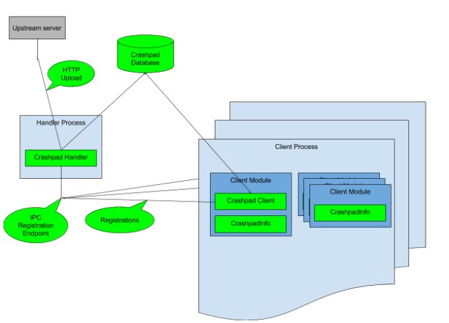 应用程序通过实例化一个进程内对象(称为“客户端”)来使用Crashpad,当检测到崩溃时,该对象报告给进程外的帮助程序—称为“处理程序”。