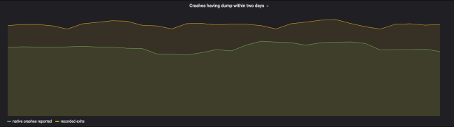 我们让应用程序在启动时发送事件来生成启动事件,通过比较启动和退出事件,可以测量退出监控的准确性。我们可以确保退出监控对绝大部分用户是成功的 (请注意防火墙等其他程序会阻止它一直运行)。此外, 我们可以将此退出事件与来自Crashpad的崩溃报告进行匹配,以确保我们预计会引起崩溃的退出代码确实包括大多数用户的崩溃情况。下图显示了我们的退出监控: