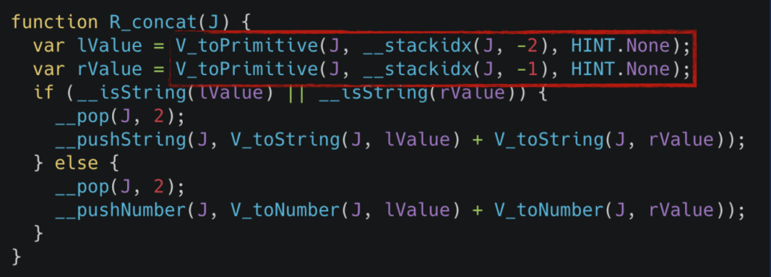 在这个实现里 toPrimitive 函数是其中最为重要也是非常重的一个函数。其内部逻辑简单来说就是它会去判断传入参数的类型,然后决定要不要调用原型上的 toString 以及 valueOf 方法,剩余的逻辑大家可以看到都是比较简单的,因此我们的优化重点就在于如何尽可能少的去调用 toPrimitive 函数。