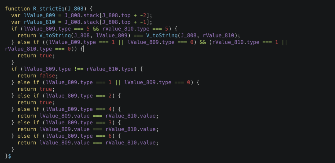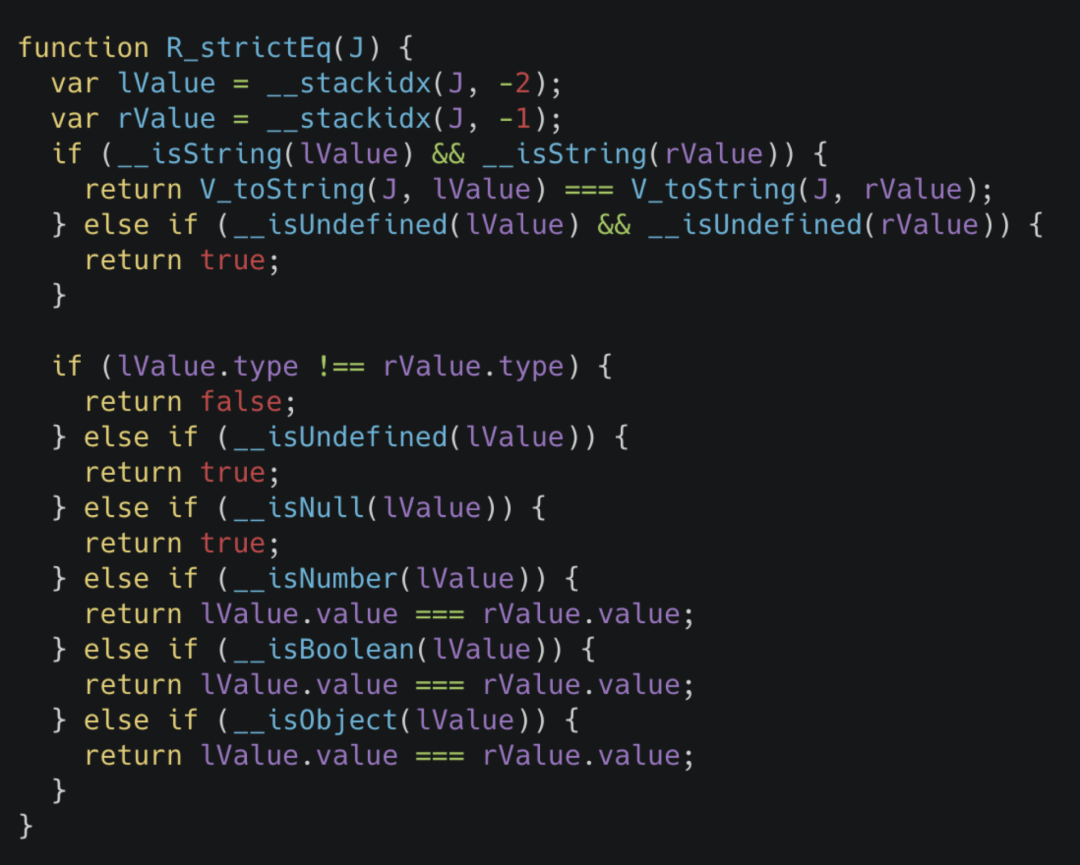 对于其他语言而言,要进行 Inline Function 这样的操作,最简单的办法就是使用宏,但我们知道 JavaScript 其实是没有这个语言特性的,所以说需要一些其他手段来达成。在这里我们先举一个 sablejs 代码中的例子。比如我们把 ECMA5.1 规范里的 strict equal 操作等价的写为代码,其类似于下面的样子。