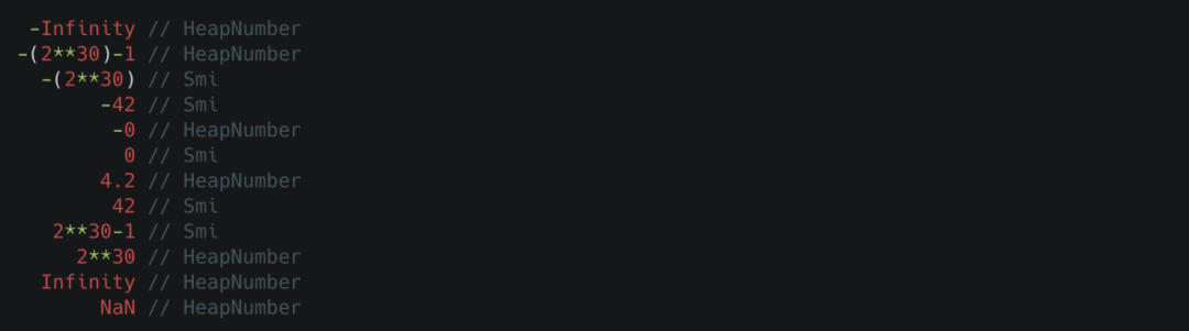 从这里就可以明显感受得到,SMI 访问会更快且内存占用也会更少。除此之外,这样做的另一个原因就在于我们日常开发过程当中经常会涉及到一些小整数,对于这些小整数而言,我们可以使用一些快速整型算法来进行加减乘除等常用操作的性能优化。