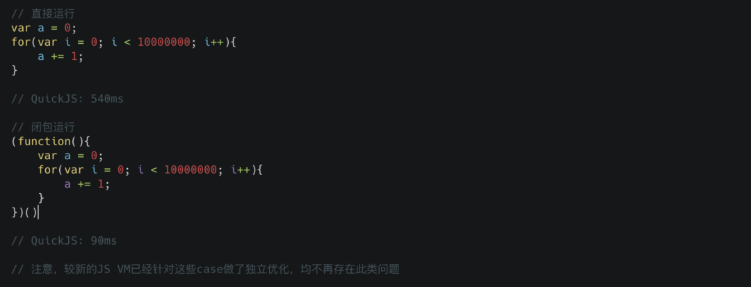 接着我们要简单讲讲关于作用域的优化,需要注意的一点是关于这块的优化每种实现都不一致,所以可能你在 V8 上不会发现任何区别,但在其他引擎上就会出现比较大的性能差距,这里我们主要拿 quickjs 来作为例子,让我们来看下方的代码示例。
