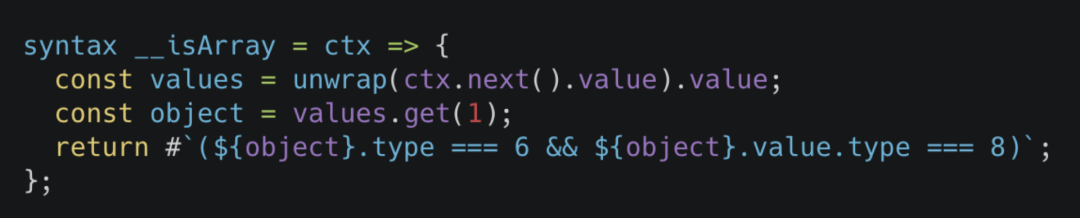 由于 JavaScript 没有宏这个东西,所以我们去社区找了一个较为成熟的宏的语法扩展:sweet.js。它的使用很简单,例如下图,我们使用 syntax 语法定义了一个 __isArray 函数,在编译过程中,如果你的代码有使用这个宏,那么编译器会把对应的 AST 对象传递给你的宏函数,最终你根据对应的相关信息生成一个语法节点返回给编译器即可执行展开操作。