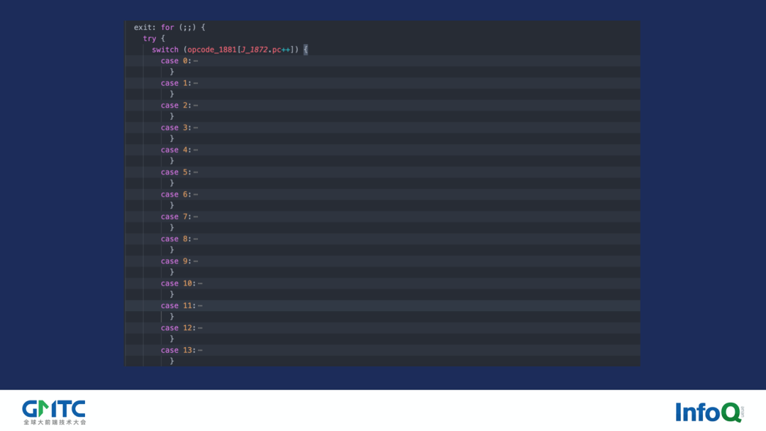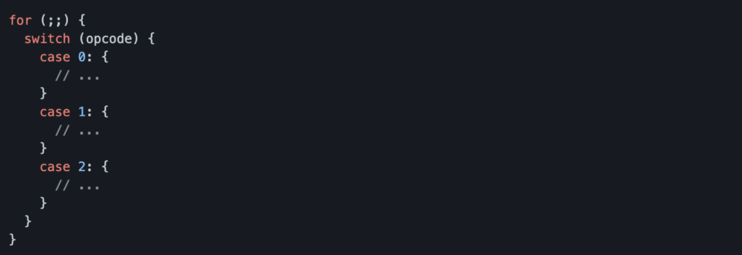 像这个一千万次的加法测试,大家可以发现 2.0 版本相比于 1.0.6 版本快 2 倍多,同时相比于 quickjs 的 WebAssembly 版本只慢了 17.39%,整个性能的提升是非常让人兴奋的。那怎么达到的呢?实际上也很简单,回到我们最开始的时候关于栈机的部分,从下图我们可以看到,栈机的实现都会有一个经典的 switch-case 结构,并且通过上面的介绍我们也知道,这个大循环里的 switch-case 是非常影响分支判断的,那么如果要在我们上述优化方案的基础上再进行优化,那唯一的思路就是:取消掉整个大循环里及其 switch-case。