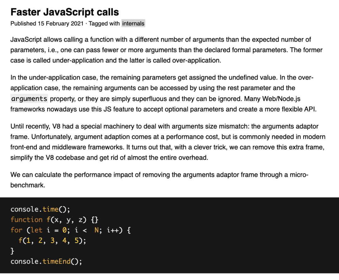 我们简单来说,假设我定义了一个含有三个参数的函数,而当我在调用这个函数的过程中我传入了五个参数,那么在这个情况下会造成什么问题呢?我们知道 JavaScript 非常灵活,如果传入参数不匹配的话,我们可以通过 arguments 来获取到其他参数。但是这种情况实际上是有代价的,因为多余的参数在底层是需要一些包装才能放置在 arguments 中的,因此如果对应函数调用太过频繁,那么这个包装的成本也是非常大的,因此如果要解决这个问题的话,我们仅需要保证参数的匹配即可。