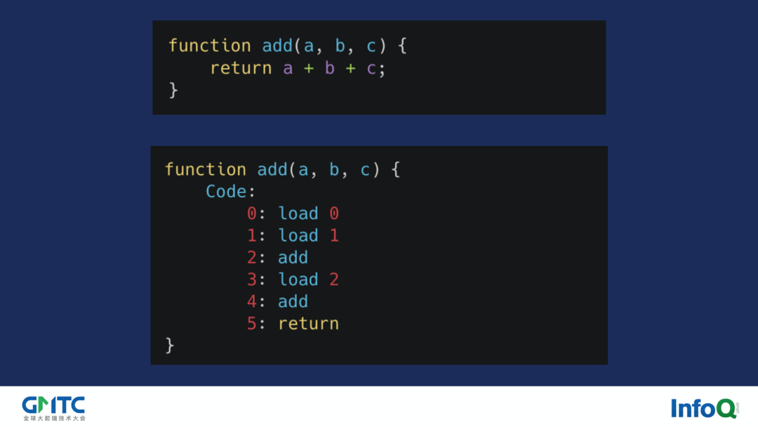为了方便解释我们用一个简单的 add 函数来进行介绍。如图的 add 函数,如果我们将其转化为 opcode 表示的话,实际上他类似于图中下方所示。load 0 代表将 a 变量压栈,load 1 代表将 b 变量压栈,接着我们调用 add 指令将两者取出相加并将对应结果压栈从而完成 a+b 的操作。然后 load 2 又将 c 变量压栈,然后再次调用 add 指令取出相加并将对应结果压榨,最后 return 指令返回栈顶结果,结束完整个 add 函数的调用。