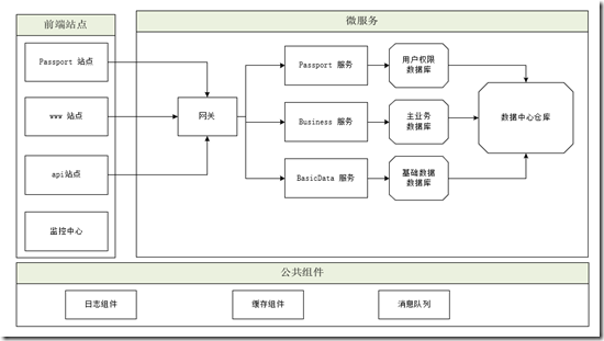 原项目基于传统三层模式组织代码逻辑,随着时间的推移,项目内各模块逻辑互相交织,互相依赖,维护起来较为困难.为此我们需要引入一种新的机制来尝试改变这个现状,在考察了 Java spring cloud/doubbo, c# wcf/webapi/asp.net core 等一些微服务框架后,我们最终选择了基于 .net core + Ocelot 微服务方式. 经过讨论大家最终期望的项目结果大致如下所示.