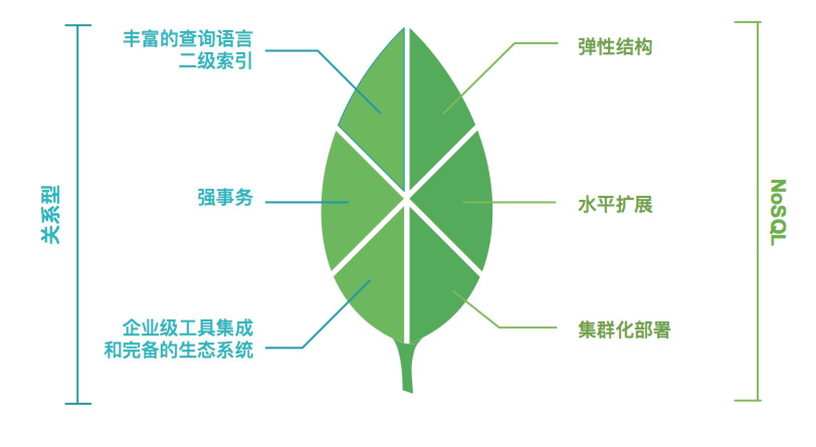 图左侧是关系型数据库的一些共性。Oracle、SQLServer、MySQL诸如此类的关系型数据库的优势就是他们使用的SQL查询语句功能非常强大,表达力很丰富。无论多复杂的问题,基本上都能够用一个或几个SQL语句完成。关系型数据库的ACID事务性,虽然各个数据库支持力度不同,但是总体来说都有不错的能力和应用程序服务器配合为程序员提供较好的事务模型,保证数据库内数据及规则的一致性。而以MongoDB领头的NoSQL数据库阵营中,则以动态数据模式和横向扩展能力为主打利器,是针对于现代的数据问题提出的解决方案。动态或者可变模式是处理新一代多变多态数据的最重要能力,否则技术团队将沦陷于无休止的关系型模式设计、迭代、数据迁移的繁琐工作中。横向扩展能力则是百度云、京东、360等大型互联网公司从MySQL集群迁移到MongoDB的主要诱因:MongoDB的分片技术,借助于数据相对独立,容易分布的JSON文档模型,在处理海量数据能力上具有更可靠的的水平扩展能力和易管理性。