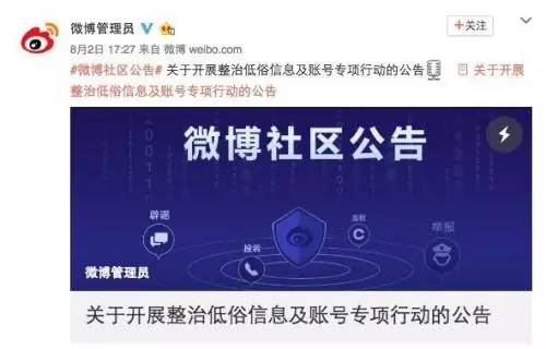 公告显示,根据《互联网文化管理暂行规定》、《网络表演经营活动管理办法》、《互联网信息服务管理办法》、《互联网新闻信息服务管理规定》等相关法律法规,以及《微博用户服务使用协议》、《微博社区公约》等社区规则,微博联合秒拍已于7月24日起开展了整治低俗信息及账号的专项行动。