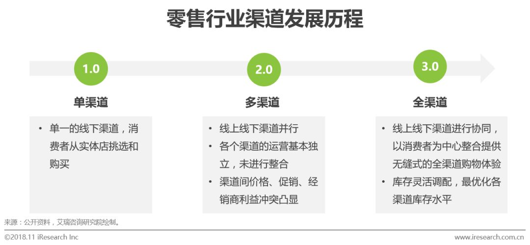 从渠道的发展历程来看,中国零售行业历经单一线下渠道,线上线下渠道并行两大阶段,目前已经逐步走向了线上线下全渠道融合的新阶段,供应链、物流、营销、服务方式也随之升级。