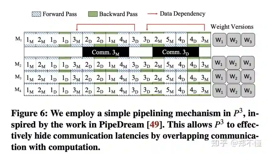 之前的一些设计都是为了减少网络消耗的时间,为了更好的overlap 通信和计算过程,P3采用了类似于PipeDream的pipeline机制。