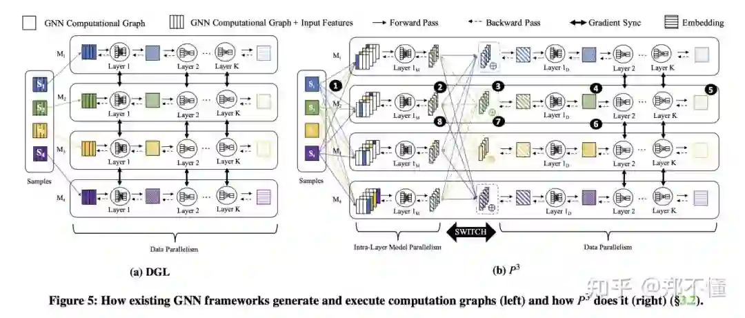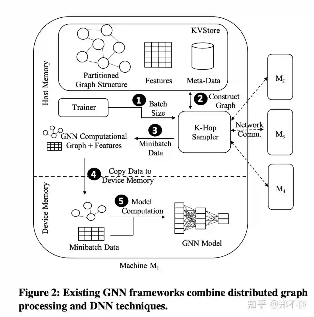 Background: GNN训练不同于传统DNN网络的的一个关键点是: DNN训练数据之间都是独立的,而图结构则是呈现一定的关联性。而且,对于图上的顶点和/或边,一般也都会带有一些高维的feature。一个K层的GNN网络,对于每个节点,都需要1-hop到k-hop的邻居构成该节点的computation graph。所以一般会使用neighborhood sampling来进一步降低整个computation graph的大小,来使其能够fit进GPU里。而且对于biliions node and edge级别的图,分布式训练就不可避免了。https://pic1.zhimg.com/80/v2-31e4a8ee85b76b46ce95083460e4e540_1440w.jpg