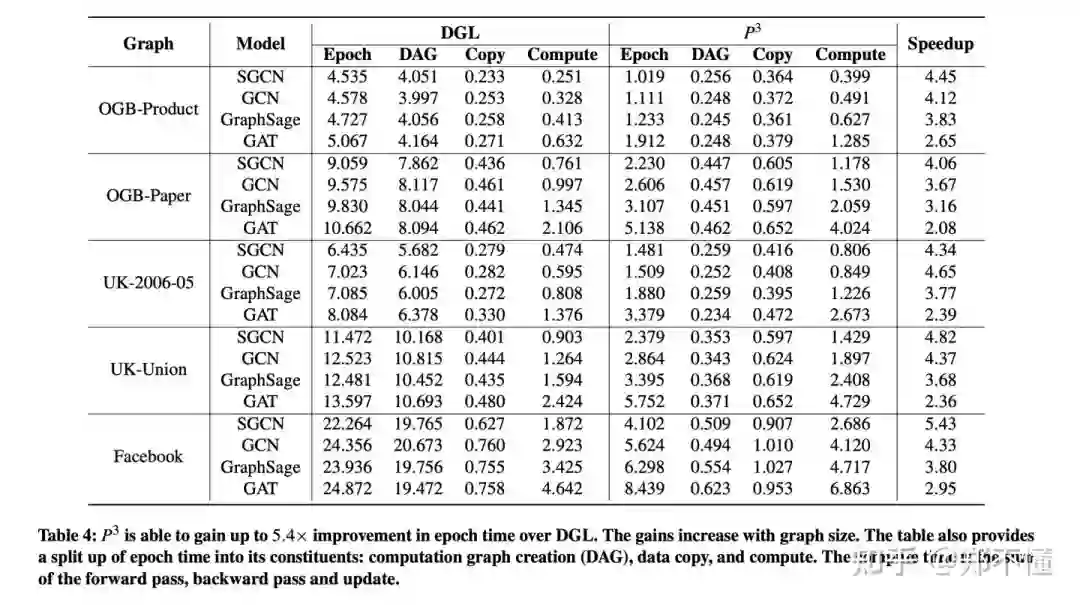 首先第一项就是看 ,第k层邻居数量和第k-1层邻居的数量,所以图的density和fanout的参数设置也可能对于性能的提升也有一定的影响,如果图比较稀疏或者对于深层的节点fanout比较小,那可能性能提升的会变少。第二项 就是5.10讨论的hidden size的问题了。但是根据RoC的观点,实际上layer和hidden_size的增加应该是会让模型性能进一步提升的。所以,这个缺点感觉还挺值得好好思考一下。第三项就是集群的规模。因为P3其实不论每台机器分到多少feature,由于model parallelism,所以要传输的数据大小是不变的,这样就导致,如果集群数量提升,那么增加的网络消耗是线性的,但是论文实验并没有显示出来(甚至throughput还是线性增长),不过论文中还是谈及了,良心。(还是 n 从2 到 4 变化不太够)