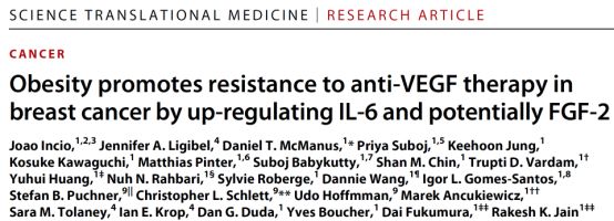 Joao Incio, Jennifer A. Ligibel, Daniel T. McManus, Priya Suboj,Keehoon Jung. Obesity promotes resistance to anti-VEGF therapy in breast cancer by up-regulating IL-6 and potentially FGF-2