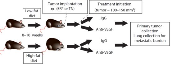 近70%的乳腺癌患者在诊断时超重或肥胖,已知乳腺肿瘤含有相当大比例的脂肪(脂肪)组织。除了VEGF之外,肥胖还与炎症和血管生成因子的水平增加有关,其可以促成抗VEGF抗性。目前的研究旨在通过增加这些因子的产生来研究肥胖促进抗乳腺癌抗VEGF治疗的假设。