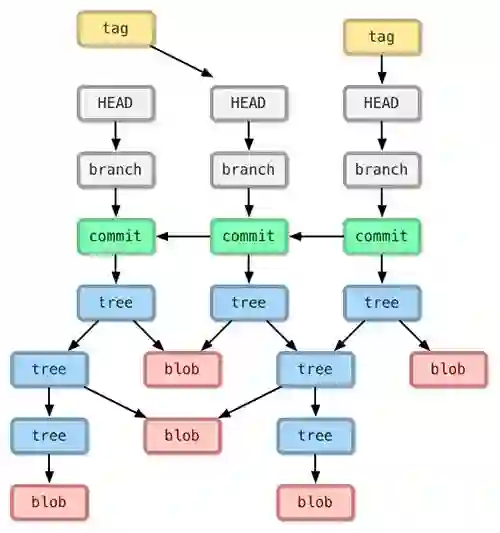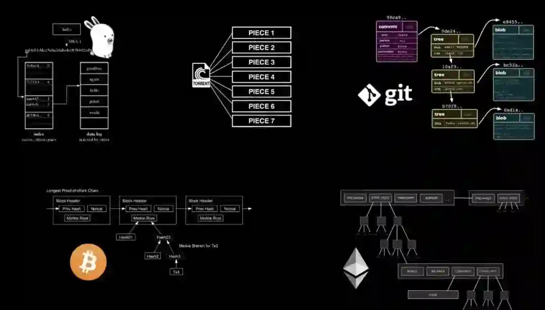 git 使用了 Merkle tree(更准确地说 Merkle DAG)来存储所有 commit 的所有 object。和 persistent data structure 思路类似,数据(commit 里的 objects)在叶子节点上,只不过连接叶子节点的索引是其 hash,而非普通的 key。Merkle DAG 的使用非常广泛,从 Plan 9 OS 到 BitTorrent,从 git 到 bitcoin / ethereum,等: