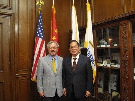 时任中国驻旧金山总领事的作者袁南生(右)与旧金山市市长李孟贤