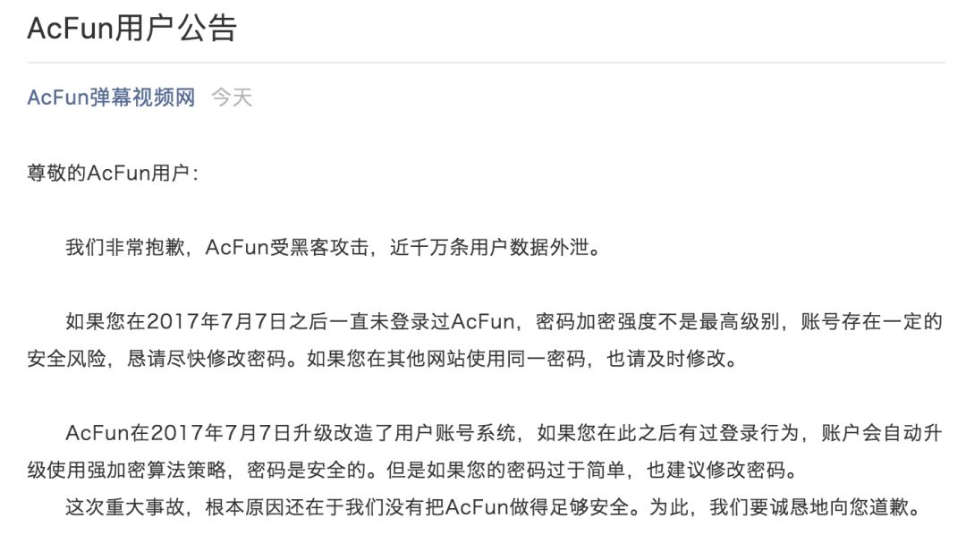 事情发生后,A 站出面解释道,在2017年7月7日之后一直未登录过AcFun,密码加密强度不是最高级别,账号存在一定的安全风险,恳请尽快修改密码。如果在其他网站使用同一密码,也请及时修改。具体内容如下: