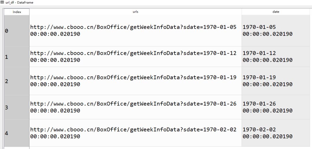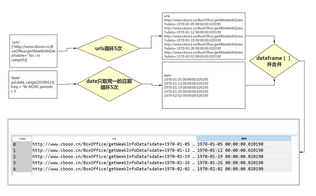 url_df = pd.DataFrame({'urls':['http://www.cbooo.cn/BoxOffice/getWeekInfoData?sdate=' for i in range(5)],'date' :pd.date_range(20190114,freq = 'W-MON',periods = 5)})