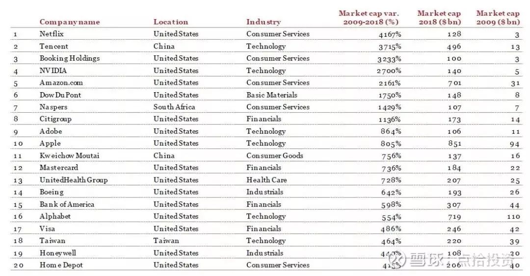 我们找到了2009年金融危机到2018年之间,全球市值前100公司表现最好的企业。这些企业都在2018年全球市值最大100强榜单中,我们认为只有涨幅变成大市值的企业才能具有代表性。比如市值从1000亿变成10000亿,和市值从10亿变成100亿,带来的影响是完全不同的。