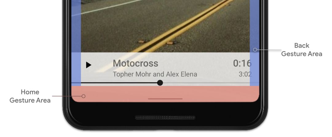 不幸的是, 进度条太靠近主屏手势区域 (Home Screen Gesture Area),所以当用户在该区域滑动时,系统把它错误地判断为用户是要执行快速切换应用的操作,这也会让用户感到困惑。支持手势导航的任何屏幕边缘区域都可能发生类似情况。有很多可能导致冲突的例子,例如: 导航抽屉 (DrawerLayout)、多图展示 (ViewPager)、进度条 (SeekBar),甚至在列表上进行滑动操作也有可能出现冲突。