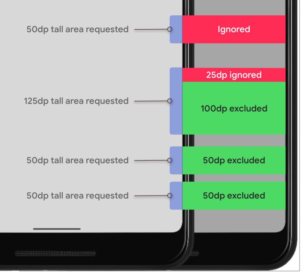 手势区域排除 API 通常会在两个地方被调用: 当视图被布局时 (onLayout),或是当视图被绘制时 (onDraw)。您的视图会传入一个 List<Rect>,其中包含应该切出 (即不响应系统手势) 的矩形区域。如前所述,这些矩形须位于视图自己的坐标系中。