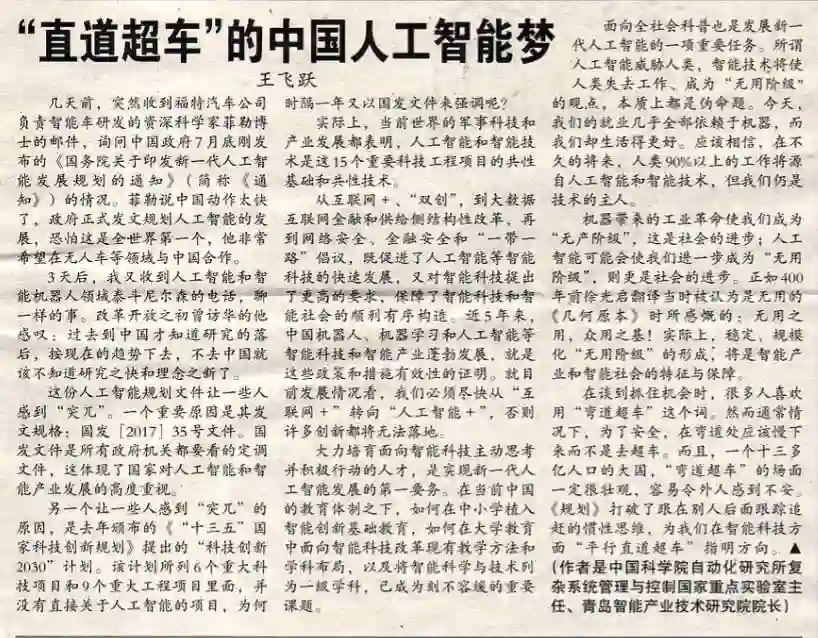 编者按:国务院近日印发《新一代人工智能发展规划》,提出了面向2030年我国新一代人工智能发展的指导思想、战略目标、重点任务和保障措施。本文是中科院自动化所王飞跃教授对《规划》的印发所作的深刻理解与思考。