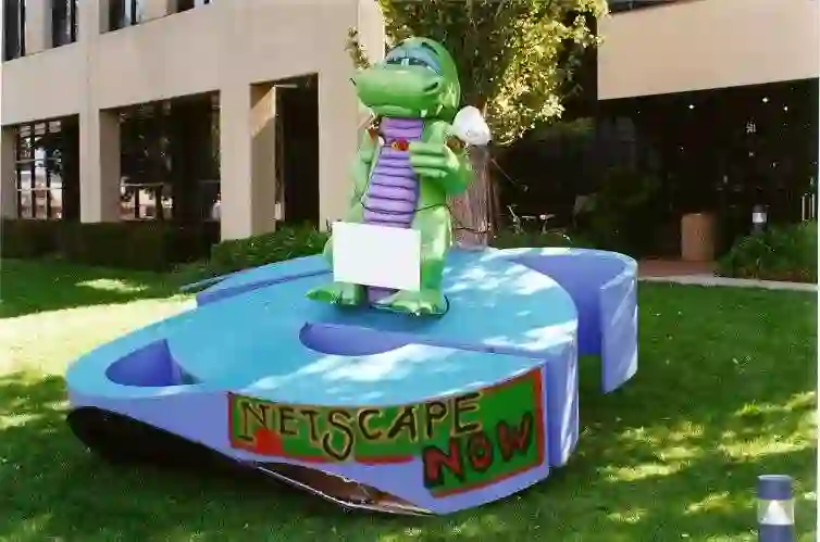 这让 Netscape 十分愤怒,他们立刻上前一把推翻对手的标志,然后摆上自己的恐龙吉祥物把微软标志踩在脚下。而且,恐龙手上拿了一个展板,上面写着“Netscape 72, Microsoft 18”(代表当时“ IE 弱 Netscape 强”的市场格局)。