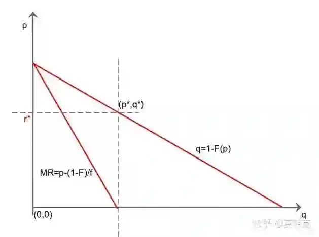 其中,q=1-F(p),代表需求函数,MR=p-(1-F)/f,代表边际收益函数 ( 也是买家的虚拟估价函数 )。